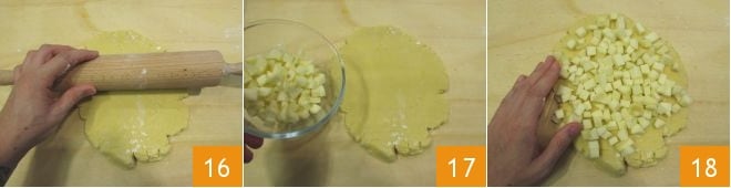 Rollt den Mürbeteig mit einem Nudelholz aus 16 und fügt die Apfelwürfel hinzu 17, indem ihr sie auf der gesamten Oberfläche des Mürbeteigs verteilt 18.