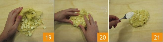 Knetet alles 19, um die Apfelwürfel gut in den Mürbeteig zu integrieren 20. Beim Kneten wird der Teig warm und feuchter, daher fügt weitere 50 g Mehl hinzu, um den Teig während der Bearbeitung wieder zu verdichten 21.