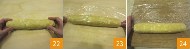 Formt aus dem Teig eine Rolle 22, wickelt sie dann in Frischhaltefolie 23 und lasst sie eine Stunde im Kühlschrank ruhen. Nach dieser Zeit nehmt die Rolle aus dem Kühlschrank und wickelt sie aus der Folie, legt sie auf ein Schneidebrett 24.