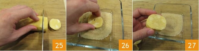 Schneidet mit einem Messer Scheiben von 1 cm Dicke 25. Mit diesen Mengen erhaltet ihr etwa zwanzig. Gebt den Rohrzucker in eine Schüssel und drückt vorsichtig eine Seite jedes Kekses in den Zucker 26, sodass die Zuckerkörner an der Oberfläche haften 27.