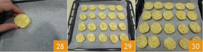 Legt die Kekse auf das mit Backpapier ausgelegte Backblech 28, gut voneinander entfernt 29, und backt sie im vorgeheizten statischen Ofen bei 180° für etwa 20-25 Minuten, bis die Oberfläche der Kekse Farbe annimmt und der Zucker eine leichte Kruste bildet. Wenn die Kekse fertig gebacken sind, nehmt sie aus dem Ofen 30 und lasst sie abkühlen, bevor ihr sie serviert: Eure Apfelkekse sind bereit zum Genießen!