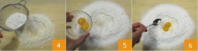 Formt die klassische Fontäne und siebt den Puderzucker 4. Fügt die 2 Eigelbe hinzu 5 und eine Prise Salz 6.