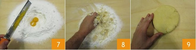 Fügt auch die abgeriebene Zitronenschale hinzu 7 und knetet schnell, um die Zutaten so wenig wie möglich zu erhitzen 8, bis ihr einen kompakten Teig erhaltet 9.