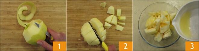 Um den Apfelkuchen ohne Butter zuzubereiten, schälen Sie zunächst 500 g Äpfel für den Teig 1 und entfernen Sie das Kerngehäuse. Übrig bleiben 360 g Fruchtfleisch zum Zerkleinern 2. Geben Sie es in eine Schüssel und beträufeln Sie es mit Zitronensaft, um zu verhindern, dass die Äpfel braun werden 3.