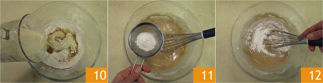 Fügen Sie nach und nach auch die Pflanzenmilch hinzu 10, während Sie mit dem Rühren beginnen. Sieben Sie das Backpulver 11 und mischen Sie es gut in den Teig 12.