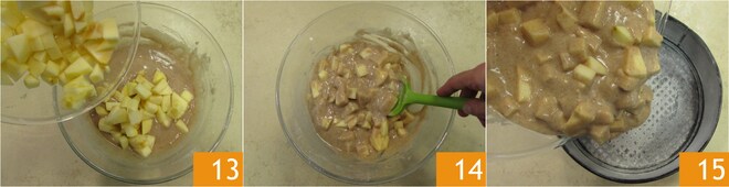 Zum Schluss die Apfelwürfel (abgetropft vom Zitronensaft) hinzufügen 13 und mit einem Teigschaber unterheben 14. Gießen Sie den Teig in eine mit Butter eingefettete und bemehlte Kuchenform mit einem Durchmesser von 22 cm 15.