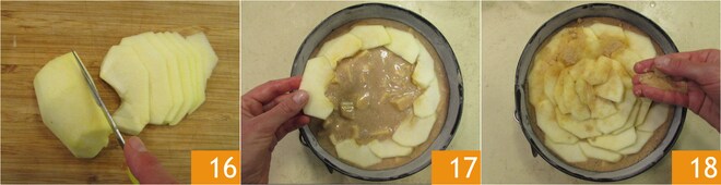 Schälen und entkernen Sie nun den Apfel für die Dekoration: Es bleiben 150 g Fruchtfleisch, das in sehr dünne Scheiben geschnitten wird 16. Legen Sie die Scheiben auf die Oberfläche des Kuchens 17 und bestreuen Sie ihn mit braunem Zucker 18.
