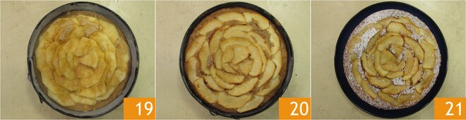 Backen Sie im vorgeheizten statischen Ofen bei 180° für 40-45 Minuten 19. Überprüfen Sie die Garzeit mit einem Zahnstocher, dann aus dem Ofen nehmen und vollständig in der Form abkühlen lassen 20. Genießen Sie Ihren Apfelkuchen ohne Butter, bestreut mit Puderzucker 21!