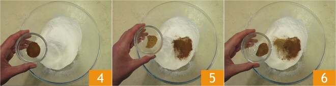 Sieben Sie das Mehl in eine Schüssel, dann fügen Sie den Zimt 4, den Ingwer 5 und die Muskatnuss, alles in Pulverform, hinzu 6.
