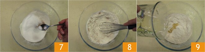 Fügen Sie den Zucker und das Salz hinzu 7, dann vermischen Sie die trockenen Zutaten mit einem Schneebesen 8. Gießen Sie das Pflanzenöl dazu 9.