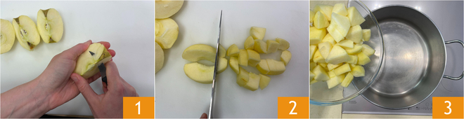 Um den Apfelkuchen mit Streuseln zuzubereiten, beginnt mit dem Apfelmus: Schält die Äpfel, schneidet sie in Viertel und entfernt das Kerngehäuse 1, ihr erhaltet etwa 220 g. Schneidet sie in Stücke 2 und gebt sie in einen Topf 3.
