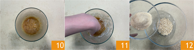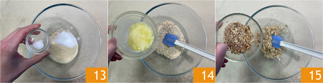 Ihr müsst ein glattes und homogenes Püree erhalten 10. Deckt es mit Frischhaltefolie ab 11, lasst es abkühlen und stellt es dann bis zur Verwendung in den Kühlschrank. Jetzt widmet euch dem Streusel: Gebt die Haferflocken und das Mandelmehl in eine Schüssel 12.