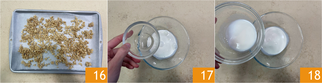 Verteilt den Streusel auf einem mit Backpapier ausgelegten Backblech 16 und stellt es für 2 Stunden in den Gefrierschrank. Geht zur Zubereitung der sauren Sahne über: Gebt die frische Sahne, den Essig 17 und die Milch 18 in eine Schüssel.