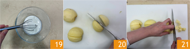 Mit dem Schneebesen mischen 19 und 20 Minuten bei Raumtemperatur stehen lassen, ohne abzudecken. Nach dieser Zeit mit Frischhaltefolie abdecken und bis zur Verwendung in den Kühlschrank stellen. Jetzt widmet euch dem Teig: Schält und schneidet die Äpfel, um etwa 220 g zu erhalten, und schneidet sie in dünne Scheiben, etwa 3 mm dick 21.
