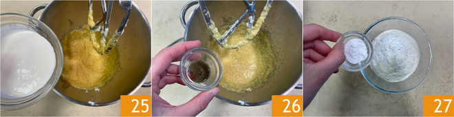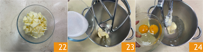 Gebt sie in eine Schüssel und stellt sie beiseite 22. In die Schüssel einer Küchenmaschine mit Rührhaken gebt die weiche Butter und den Zucker 23 und schaltet auf mittelhohe Geschwindigkeit. Sobald eine cremige Konsistenz erreicht ist, stoppt die Maschine gelegentlich, um den Teig von den Rändern mit einem Spatel abzukratzen. Gebt die Eier nacheinander hinzu 24.