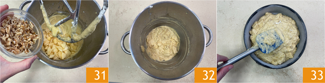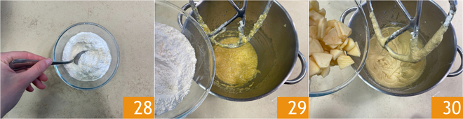 Mit einem Löffel mischen 28 und das Mehlgemisch in die Küchenmaschine geben 29. Sobald alles vermischt ist, die Geschwindigkeit reduzieren und die Äpfel einarbeiten 30.