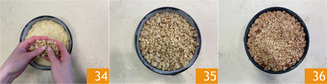 Verteilt den zerbröselten Streusel auf der Oberfläche 34. Backt im vorgeheizten statischen Ofen bei 160° für 60 Minuten 35. Nach dem Backen aus dem Ofen nehmen und vollständig abkühlen lassen 36.