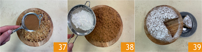 Den Kuchen aus der Form nehmen und die Oberfläche mit Zimt 37 und Puderzucker 38 bestäuben. Der Apfelkuchen mit Streuseln ist servierfertig 39!