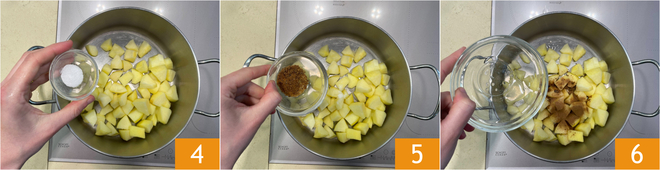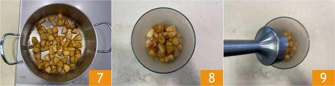 Kocht bei mittlerer bis niedriger Hitze etwa 15 Minuten, rührt gelegentlich mit einem Löffel um, bis die Äpfel gar sind 7. Gebt die gekochten Äpfel in einen Krug 8 und püriert sie mit einem Stabmixer 9.
