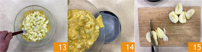 Fügen Sie die trockenen Zutaten nach und nach zur Mischung hinzu 10 und arbeiten Sie weiter mit dem elektrischen Mixer 11, bis der Teig homogen ist. Lassen Sie die Äpfel aus dem überschüssigen Zitronensaft ab und tauchen Sie sie in den Teig 12.