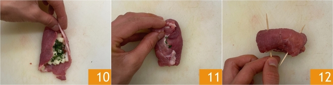 Falten Sie die Seiten der Fleischscheibe zur Mitte hin 10, rollen Sie sie dann von unten nach oben auf und achten Sie darauf, sie gut zu verschließen, um die Füllung zu versiegeln 11. Befestigen Sie die Enden mit einem Zahnstocher 12 und fahren Sie auf diese Weise fort, um die restlichen Röllchen zu formen.