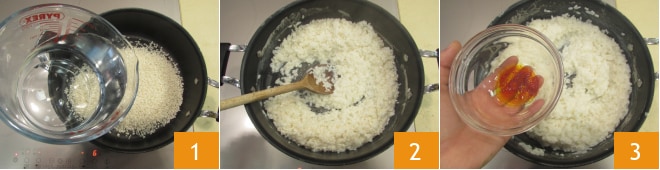 Um die Arancini mit rotem Bohnenragout zuzubereiten, beginnen Sie mit dem Kochen des Reises. Rösten Sie ihn kurz in einem Topf an, dann mit Wasser bedecken 1 und garen, bis die Mischung am Ende sehr trocken ist 2. Zur Hälfte der Garzeit daran denken, den Safran in sehr wenig Wasser verdünnt hinzuzufügen und mit Salz abzuschmecken 3.