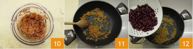 Wenn Sie eine sehr feine Mischung haben 10, braten Sie sie in einem Topf mit einem Spritzer Öl an 11. Nach ein paar Minuten die vorgekochten, gespülten und abgetropften Bohnen hinzufügen 12.