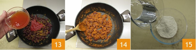 Zum Schluss die Tomatenpassata hinzufügen und mit einem Spritzer Wasser verdünnen 13, so können Sie bei schwacher Hitze etwa zwanzig Minuten garen; mit Salz und Pfeffer abschmecken 14. Bereiten Sie auch den Teig vor, indem Sie Mehl und Wasser in eine Schüssel geben 15.