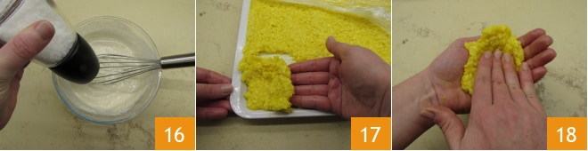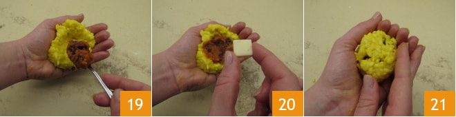 Gut mit einem Schneebesen arbeiten, um eine glatte und klumpenfreie Mischung zu erhalten, mit einer Prise Salz abschmecken 16 und mit der Formung der Arancini fortfahren. Mit gefetteten Händen eine Portion der Mischung nehmen, insgesamt 12, 17 und in der Hand eine kleine Mulde formen 18.