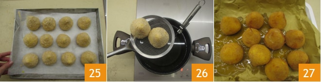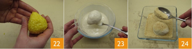 und die Spitze formen, so ist der erste bereit 22. Machen Sie so mit den anderen weiter und tauchen Sie dann jeden einzeln in den Teig 23. Dann abtropfen lassen und in Paniermehl wälzen 24.