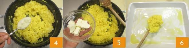 Wenn der Reis fertig ist, fügen Sie bei ausgeschalteter Flamme den geriebenen Käse 4 und einige Stücke Butter 5 hinzu. Mischen, bis alles aufgenommen ist, und in ein gefettetes Gefäß umfüllen 6.