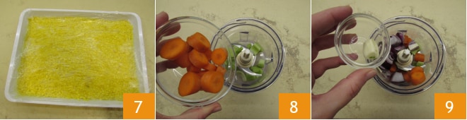 Drücken Sie den Reis flach, bedecken Sie ihn und lassen Sie ihn ein paar Stunden bei Raumtemperatur abkühlen 7. In der Zwischenzeit bereiten Sie das rote Bohnenragout vor. Im Mixer den Sellerie, die Karotte 8, die rote Zwiebel und die Knoblauchzehe schnell hacken 9.