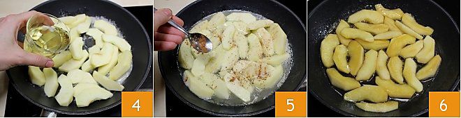 Beträufeln Sie die Äpfel mit dem Wein 4, fügen Sie den Zimt hinzu 5 und lassen Sie sie auf sehr niedriger Flamme kochen (ohne sie mit einem Holzlöffel zu berühren, um sie nicht zu zerbrechen), bis die Äpfel gekocht und karamellisiert sind 6.