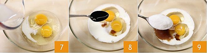 Machen Sie nun mit der Zubereitung des Pain Perdu weiter: Brechen Sie in einer Schüssel die Eier auf und fügen Sie die Milch 7, den Vanilleextrakt 8 und den Zucker 9 hinzu.