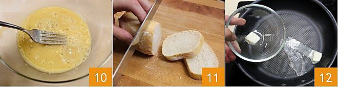 Schlagen Sie alles mit einer Gabel gut durch, um die Zutaten gut zu vermischen 10. Schneiden Sie Scheiben (nicht zu groß, wenn doch, dann teilen Sie sie in zwei Hälften) von altbackenem Brot 11 und lassen Sie genügend Butter schmelzen, um den Boden einer Antihaftpfanne zu bedecken 12.