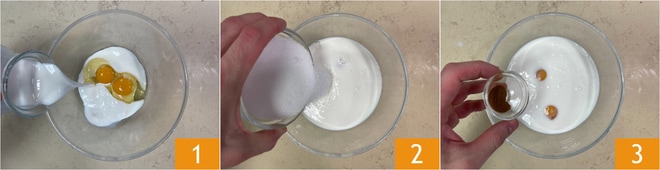 Um den Pain Perdu zuzubereiten, schlagen Sie zuerst die Eier in eine Schüssel, dann fügen Sie die Sojamilch 1, den Zucker 2 und den Zimt 3 hinzu.