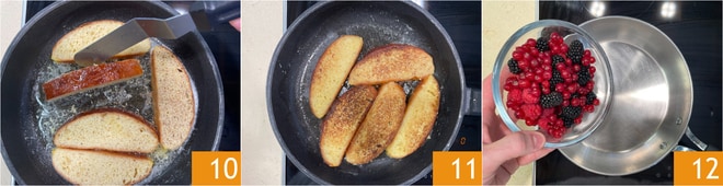 Braten Sie sie bei mittlerer Hitze 1-2 Minuten pro Seite 10, bis sie goldbraun sind 11, und legen Sie sie beiseite. Während Sie alle Briochebrotscheiben braten, bereiten Sie die Sauce vor: Geben Sie die Waldbeeren in eine Pfanne 12.