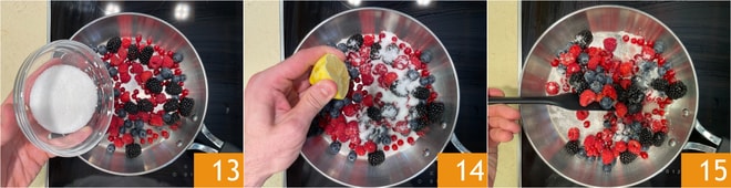 Fügen Sie den Zucker 13, den Zitronensaft 14 hinzu und kochen Sie bei mittlerer Hitze 5-7 Minuten 15.