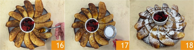 Zum Anrichten gießen Sie die Waldbeerensauce in eine kleine Schüssel, stellen Sie sie in die Mitte des Serviertellers und legen Sie die Briochebrotscheiben strahlenförmig darum. Vervollständigen Sie das Gericht mit Ahornsirup 16 und Puderzucker 17. Ihr Pain Perdu ist servierbereit 18.