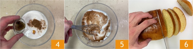 Fügen Sie auch den Vanilleextrakt 4 hinzu und mischen Sie mit einem Schneebesen 5, um die Zutaten zu kombinieren. Schneiden Sie das Briochebrot in ziemlich dicke Scheiben, etwa 2-3 cm dick 6. Sie sollten 10 Stücke erhalten.