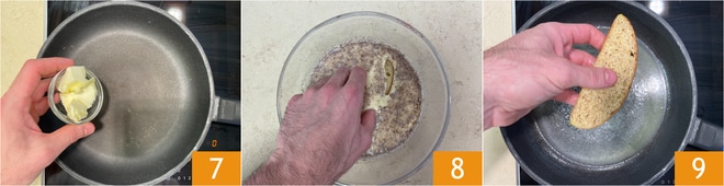 Schmelzen Sie die Butter 7 in einer Antihaftpfanne, tauchen Sie dann die Briochebrotscheiben in die Milch-Ei-Mischung 8 und legen Sie sie in die heiße Pfanne 9.
