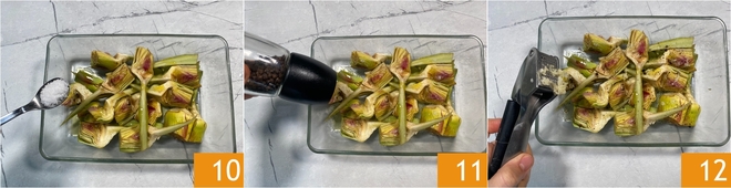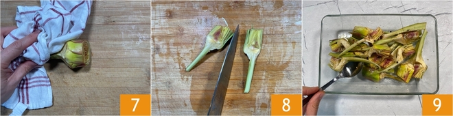 Nachdem Sie alle Artischocken gereinigt haben, tupfen Sie sie mit einem Tuch ab 7 und schneiden sie in vier Teile 8. Geben Sie sie in eine Auflaufform und würzen Sie sie mit dem extra nativen Olivenöl 9.