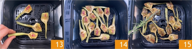 Platzieren Sie jedes Artischockenstück in den Frittierkorb, ohne sie zu stapeln 13. Kochen Sie die Artischocken bei einer Temperatur von 160 Grad für 8 Minuten 14, wir haben eine 6 l Fritteuse verwendet. Nach dieser Zeit fügen Sie die Kräuter hinzu; ein paar Rosmarinnadeln und einige Thymianblättchen 15.