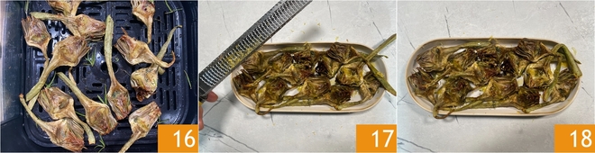 Kochen Sie nur noch 2 Minuten, oder bis sie schön goldbraun sind 16. Wenn sie abgekühlt sind, würzen Sie sie mit einer Prise Zitronenschale 17 und Ihre Artischocken in der Heißluftfritteuse sind bereit zum Servieren 18!