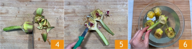 Fahren Sie fort, indem Sie den oberen Teil mit den Dornen abschneiden 4, sie halbieren und auch das Innere entfernen 5, tauchen Sie sie schließlich in eine Mischung aus Wasser und Zitronensaft 6, um sie nicht zu verfärben.