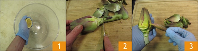 Um die Artischocken in der Pfanne zuzubereiten, bereiten Sie eine Schüssel mit säurehaltigem Wasser 1 vor, in die Sie die Artischocken nach und nach legen, während Sie sie putzen. Ziehen Sie Handschuhe an, um Ihre Hände nicht zu verschmutzen: Schneiden Sie einen Teil der Basis ab, den härtesten 2. Entfernen Sie dann die äußeren, härteren Blätter 3, bis Sie zum Herz gelangen: Die Blätter haben eine hellere Basis.