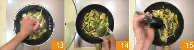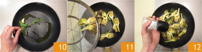 Fügen Sie einen Zweig Minze hinzu 10 und geben Sie die abgetropften Artischocken hinein 11. Salzen Sie 12 und lassen Sie sie kurz anbraten, während Sie umrühren oder die Pfanne schütteln