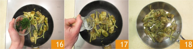 Würzen Sie mit der Petersilie 16, rühren Sie nochmals um. Dann fügen Sie Wasser hinzu und lassen Sie es weitere 10 Minuten kochen 17, diesmal ohne Deckel. Ihre Artischocken in der Pfanne sind fertig, servieren Sie sie sofort 18.
