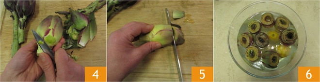 Mit einem Schälmesser (oder einem Gemüseschäler) schälen Sie die Artischocken 4, schneiden auch die Spitzen ab 5 und legen sie nach und nach in das säurehaltige Wasser 6.