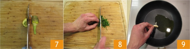 Einer nach dem anderen, abtropfen lassen und halbieren 7: Entfernen Sie das innere Barthaar immer noch mit dem Schälmesser. Teilen Sie jede Hälfte nochmals, um Spalten zu erhalten. Tauchen Sie sie nach und nach wieder in das säurehaltige Wasser. Waschen und hacken Sie die Petersilie fein 8. Erhitzen Sie einen Schuss Öl in einer Pfanne mit Knoblauch 9.